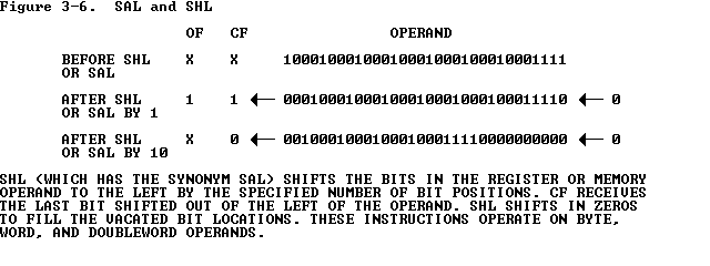SAL (Shift Arithmetic Left) shifts the destination byte, word, or doubleword operand left by one or by the number of bits specified in the count operand (an immediate value or the value contained in CL). The processor shifts zeros in from the right (low-order) side of the operand as bits exit from the left (high-order) side. See Figure 3-6.