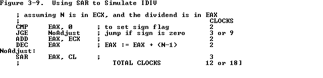 The code sequence in Figure 3-9 produces the same result as IDIV for any M = 2^(N), where 0 < N < 32. This sequence takes about 12 to 18 clocks, depending on whether the jump is taken; if ECX contains M, the corresponding IDIV ECX instruction will take about 43 clocks.