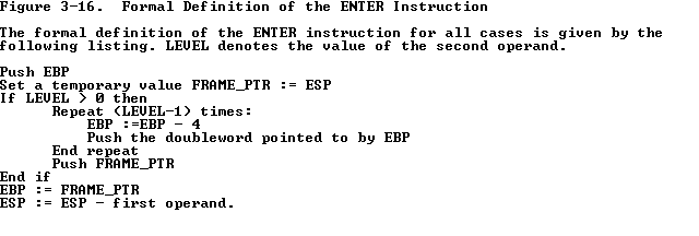 ENTER (Enter Procedure) creates a stack frame that may be used to implement the scope rules of block-structured high-level languages. A LEAVE instruction at the end of a procedure complements an ENTER at the beginning of the procedure to simplify stack management and to control access to variables for nested procedures.