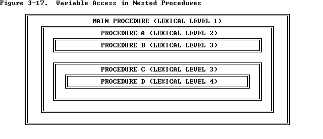 Block-structured high-level languages can use the lexical levels defined by ENTER to control access to the variables of previously nested procedures. Referring to Figure 3-17 for example, if PROCEDURE A calls PROCEDURE B which, in turn, calls PROCEDURE C, then PROCEDURE C will have access to the variables of MAIN and PROCEDURE A, but not PROCEDURE B because they operate at the same lexical level. Following is the complete definition of access to variables for Figure 3-17 .