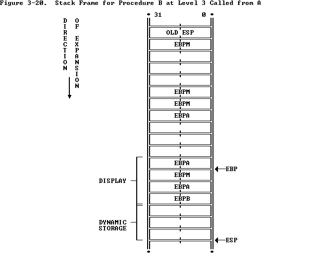 After MAIN calls PROCEDURE A, ENTER creates a new display for PROCEDURE A with the first word pointing to the previous value of EBP (BPM for LEAVE to return to the MAIN stack frame) and the second word pointing to the current value of EBP. Procedure A can access variables in MAIN since MAIN is at level 1. Therefore the base for the dynamic storage for MAIN is at [EBP-2]. All dynamic variables for MAIN are at a fixed offset from this value. See Figure 3-19 .