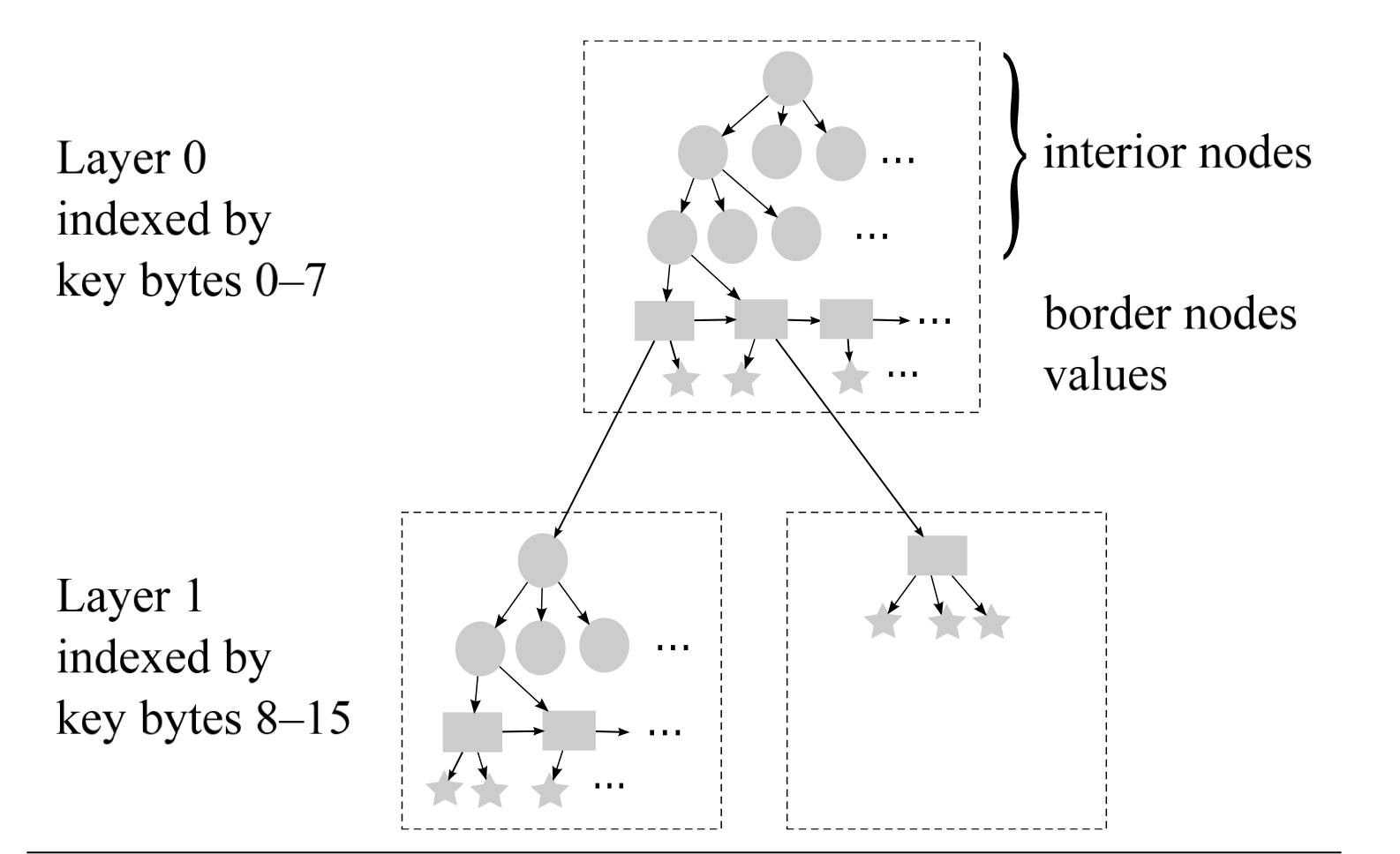 - Each layer in the trie is a B– tree that resolves one