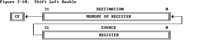 SAL (Shift Arithmetic Left) shifts the destination byte, word, or doubleword operand left by one or by the number of bits specified in the count operand (an immediate value or the value contained in CL). The processor shifts zeros in from the right (low-order) side of the operand as bits exit from the left (high-order) side. See Figure 3-6.