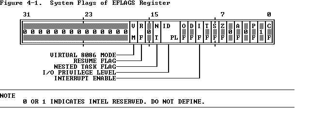 The systems flags of the EFLAGS register control I/O, maskable interrupts, debugging, task switching, and enabling of virtual 8086 execution in a protected, multitasking environment. These flags are highlighted in Figure 4-1 .