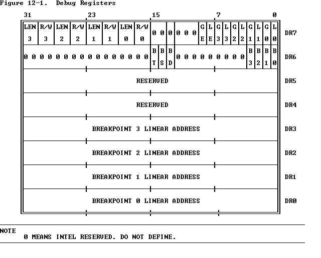 For each address in registers DR0-DR3, the corresponding fields R/W0 through R/W3 specify the type of action that should cause a breakpoint. The processor interprets these bits as follows: